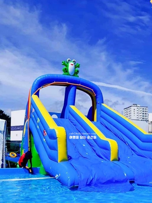 울산 울주군의 청량한 바다를 눈앞에 두고 즐기는 오션뷰 물놀이장. 진하해수욕장에 마련된 이 공간은 아이부터 어른까지 모두 신날 수밖에 없는 7월 국내가족여행지 추천 여름 피서지입니다. 수심 50cm, 70cm, 90cm로 나뉜 수영장은 연령대에 맞게 안전하게 구성되어 있고, 커다란 파라솔과 대형 물미끄럼틀까지 더해져 보기만 해도 즐거운 풍경을 완성해 줍니다.