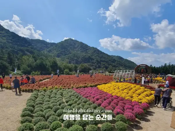 국화 향이 가득한 꽃터널을 걷다 보면 마음까지 가벼워지는 느낌이었고 핑크뮬리와 국화가 어우러진 포인트에서 찍은 사진은 무조건 인생샷입니다.