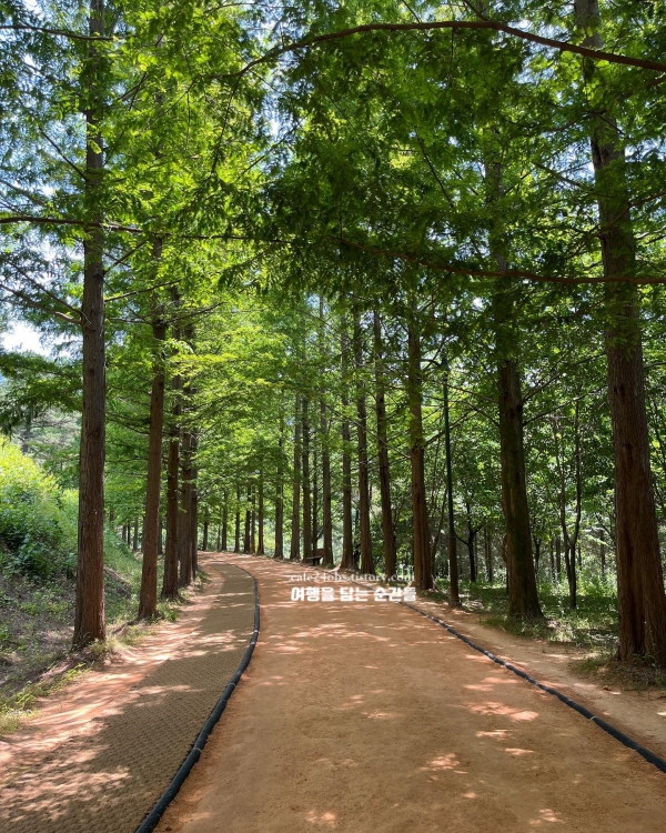 금강수목원은 세종과 가까운 거리지만, 한 걸음만 들이면 훨씬 더 멀리 온 듯한 분위기를 느낄 수 있는 세종 근교 가볼만한곳 베스트 10 곳입니다. 황토메타길은 길이는 짧지만 맨발로 걸었을 때 발바닥에 닿는 황토의 느낌이 생각보다 부드럽고 따뜻해서 잠시 걷는 것만으로도 피로가 풀리는 듯했어요. 메타세쿼이아가 양옆으로 길게 늘어서 있어 자연 속 터널을 걷는 느낌이 들었고, 창연정에 이르러 금강을 내려다보는 뷰도 조용하게 머무르기 좋은 지점이었습니다.