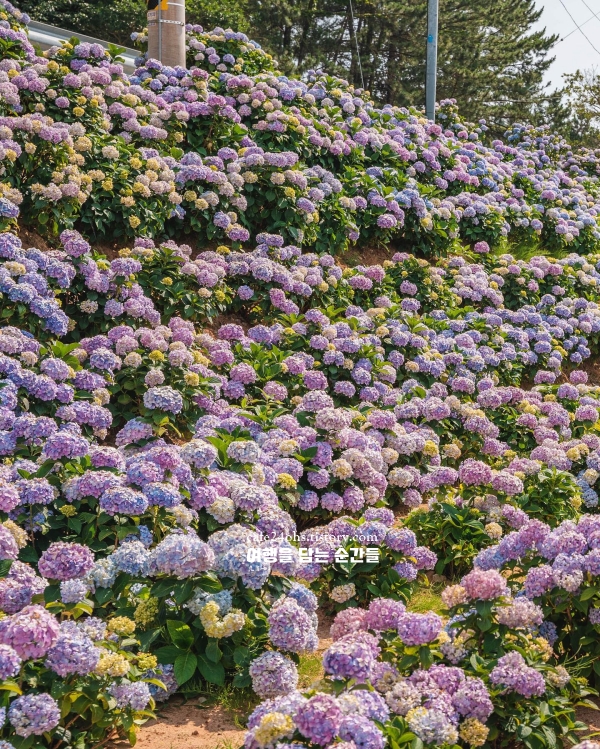 6월 중순이면 수국이 거의 만개해서, 바닷바람 타고 꽃향이 퍼진다. 사람은 많지만 어수선하지 않고, 간단히 음료나 간식 살 수 있는 소규모 가게들도 군데군데 있다. 주차는 마을 진입 전에 도로변이나 임시 주차 공간을 이용해야 해서 조금 걷게 되지만, 그 구간도 이미 꽃길이다. 입장료 같은 건 따로 없고, 바다와 수국을 그냥 걷는 여행이다.