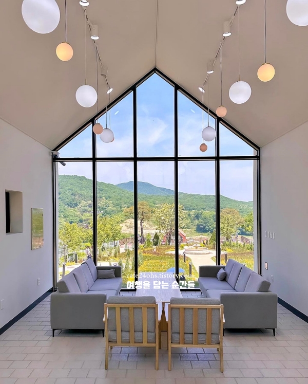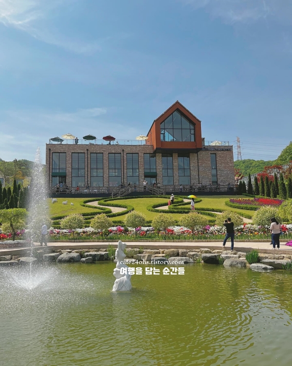 베툴라는 자작나무숲을 배경으로 정원이 넓게 펼쳐진 공간이다. 카페라는 이름보다, 걷다 머물 수 있는 정원에 가까운 느낌이다. 정원 중간엔 분수와 폭포가 자리하고 있고, 그 주변을 따라 산책로가 연결된다. 6월이면 수국이 피기 시작하고, 수레국화와 장미도 함께 어우러져 꽃들이 시야를 나눠 가진다. 튤립은 이미 지난 계절이고, 지금은 수국의 계절이다. 카페 내부는 3층 규모로, 통창으로 나뉜 풍경이 층마다 다르다. 햇살 아래선 바깥을 걷고, 피곤해질 때쯤 천천히 실내로 들어가면 된다.
