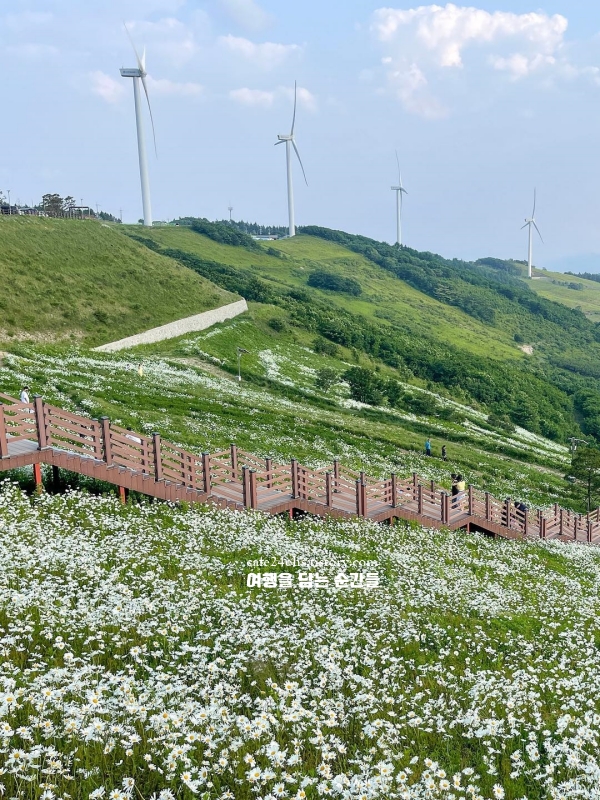 초지에는 22기의 대형 풍력 발전기가 돌아가며, 샤스타데이지 외에도 금계국, 수레국화, 패랭이꽃 등이 형형색색으로 피어 있어 다양한 꽃을 감상할 수 있다. 삼각대나 셀카봉을 지참하면 인생샷을 남기기에 좋다. 새벽이나 오전 시간대에는 운해와 아침 햇살이 겹치는 장관을 볼 수 있으므로, 이른 시간에 방문하는 것을 추천한다.